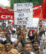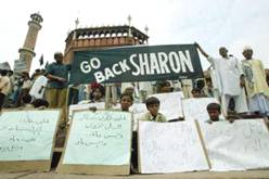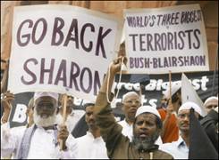 Sharon pledge to boost ties with India triggers protests By: Irfan Malik NEW DELHI, India: Thousands of Muslims took to the streets in Indian cities as well as Indian-occupied Kashmir on Tuesday to protest a trip by Israeli Prime Minister Ariel Sharon, chanting: “Go back Sharon – killer of innocent Palestinians.” Police detained more than 100 Muslim protesters in the financial capital of Bombay, where Sharon is due Thursday. Massive rallies and demonstrations were witnessed in Bombay, New Delhi, Old Delhi, Calcutta and many other cities. Protestors were carrying large anti-Sharon banners and placards inscribed with the slogans: “World’s three biggest terrorist – Bush-Blair-Sharon,” “He is a terrorist,” “Sharon is a war criminal,” and “Butcher Sharon.”